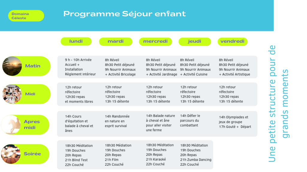 Ici, pas de vacarme, ni d’agitation, on retrouve le bon sens : des journées au grand air, des rires a n’en pas finir, des enfants polis, des moments simples qui laissent de vrais souvenirs. On respecte la nature, les animaux, les autres, mais avant tout soi même.